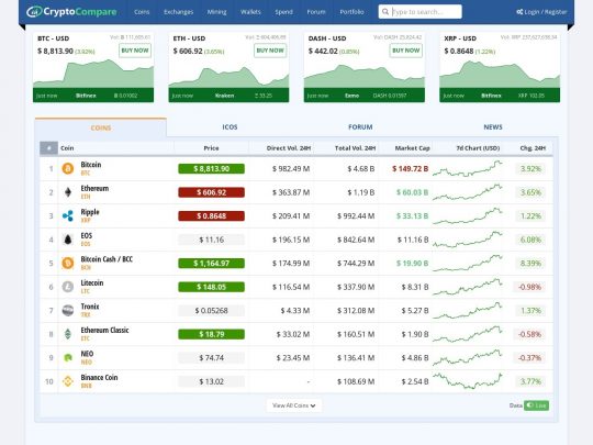 Crypto Compare has all the live crypto currency prices, trades, volumes, forums, wallets, mining equipment and best of all, reviews of them all.
