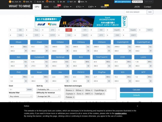 WhatToMine is a crypto coins mining profit calculator to Ethereum (GPU) or Bitcoin (ASIC).