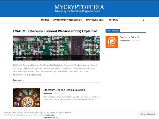 MyCryptopedia is an encyclopedia-style, or wiki-style information website to learn about cryptocurrency & blockchain. Their motto is “Educating the world on cryptocurrency”, lots of great crypto technologies articles, on Bitcoin and various other coins.