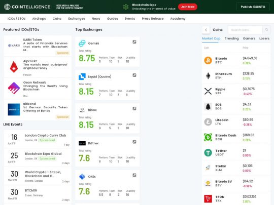 Cointelligence is a site with loads of data and content. They do crypto exchange reviews and ratings, top market cap, trending, gainers, losers etc the same way that Coinmarketcap has their listings, news, guides, events listings and lots more information. Their motto is “The data layer of the crypto economy”.