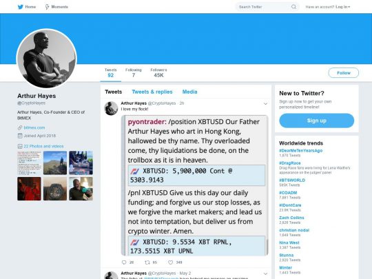 CEO of Bitmex Arthur Hayes is a high profile crypto figure to follow on Twitter. He’s knowledgeable and entertaining too, check him out!