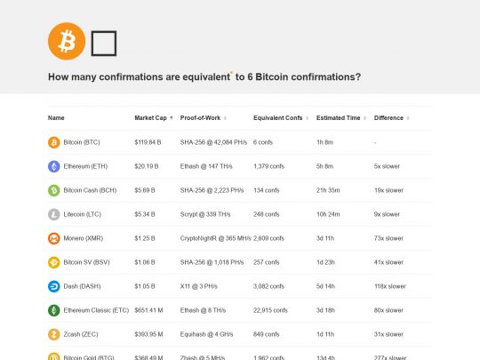 How many confirmations are equivalent to 6 Bitcoin confirmations? This website you can check Bitcoin, Ethereum, Litecoin, Bcash, Monero, and many other altcoins, and how they compare to Bitcoin on confirmations and estimated times.