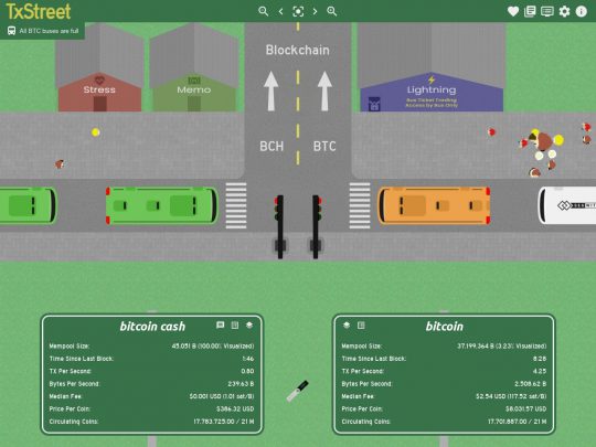 TxStreet.com is a Bitcoin (BTC) and Bitcoin Cash (BCH) transaction visualizer. Watch the blocks fill and take off to the blockchain with a nice visual, using little cartoon people and buses.