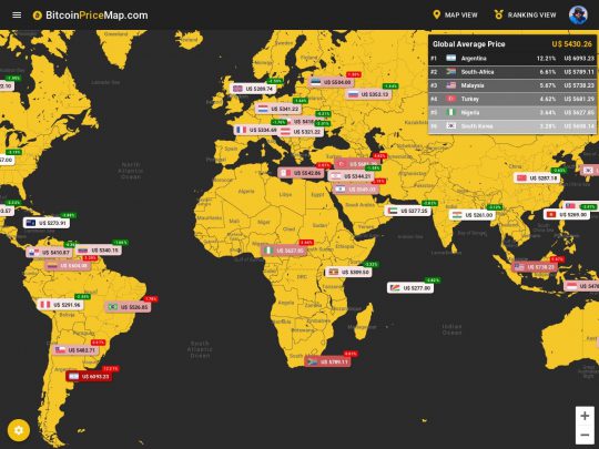Bitcoin Price Map (bitcoinpricemap.com) is a great interactive website which shows a map of the world and the different prices of Bitcoin per country. Zoom in, zoom out, scroll around to find the country/prices you wish to see 🙂
