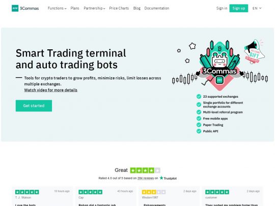 3Commas is an automated Bitcoin & altcoins trading bot. You can trade among 23 support crypto exchanges, paper trading & a friend refer system too.